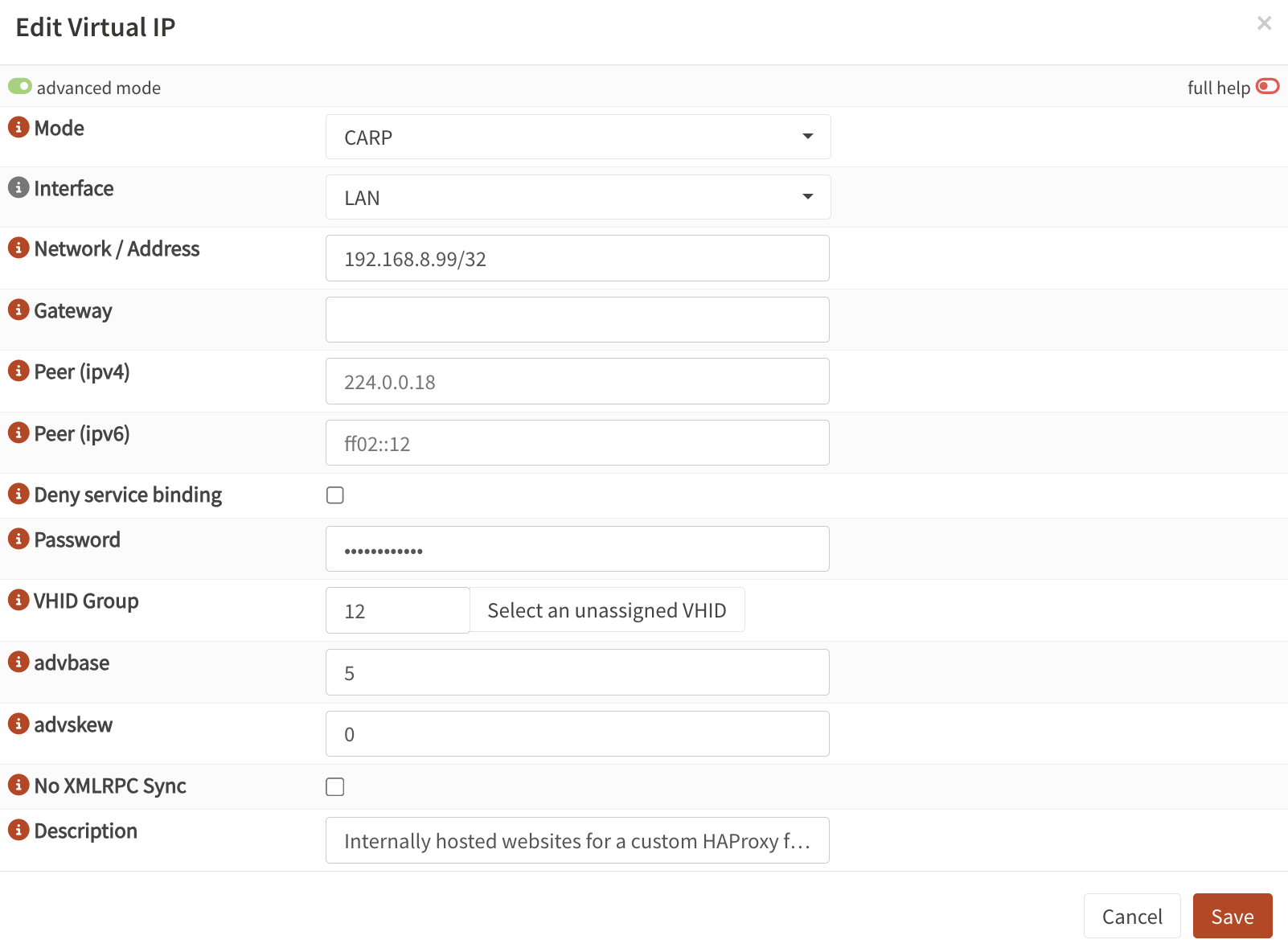 - Password: set a unique password that will be shared amongst your OPNSense cluster