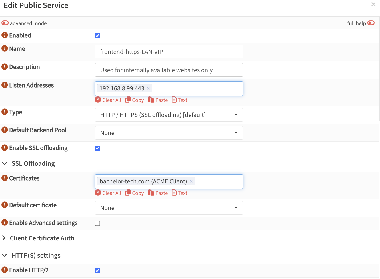 - Certificates: select the one you created in the ACME Client we configured earlier