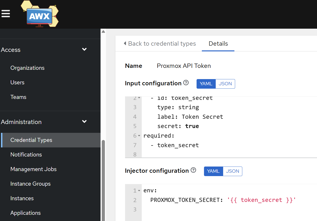- In AWX, scroll down to Administration → Credential types. Add a new credential.