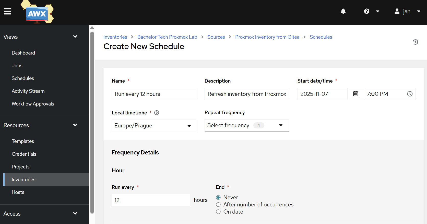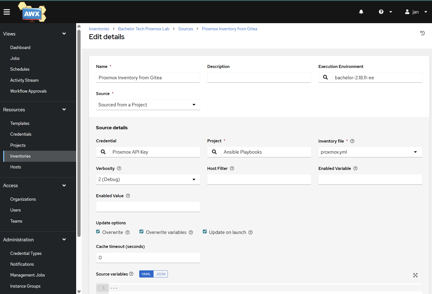 Proxmox API key, which we created earlier.Project: Click on the 🔍 icon and select yourAnsible Playbooksproject (the one you just synced).Inventory file: Click the dropdown and typeproxmox.yml(this is one of the files fetched from Gitea in the previous step). While the dropdown will appear empty, simply type it and then confirm the selection, so that the manually typed file name will stay there. It is a bit of a poor UI behavior. If you still struggle, save it without the file name and then edit it again