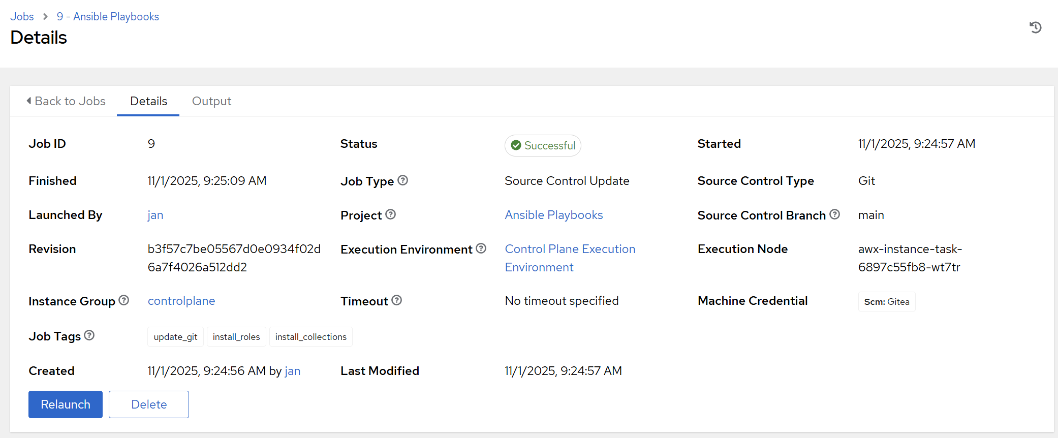 awx-taskpod connects to the Gitea server, authenticates with the credentials, runs agit clone(orgit pullif done again) to copy the files from the private repo into a folder on the AWX server (under/var/lib/awx/projects/...). - What has NOT happened yet is that none of our Proxmox infrastructure was reached out to yet, no inventory was updated yet.