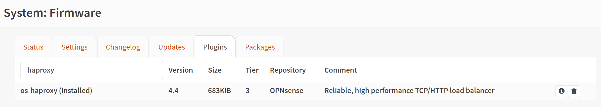 - In case you do not yet have HAPRoxy installed/enabled on your OPNSense, go ahead to ‘System’ → ‘Firmware’ → ‘Plugins’ and download it.