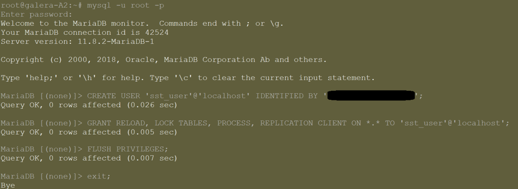 # Log into your MariaDB instance mariadb -u root -p CREATE USER 'sst_user'@'localhost' IDENTIFIED BY 'YourSuperSecurePassword'; GRANT RELOAD, LOCK TABLES, PROCESS, REPLICATION CLIENT ON *.* TO 'sst_user'@'localhost'; FLUSH PRIVILEGES; EXIT;