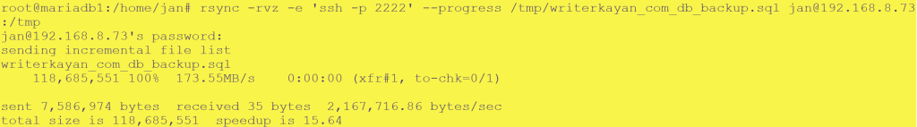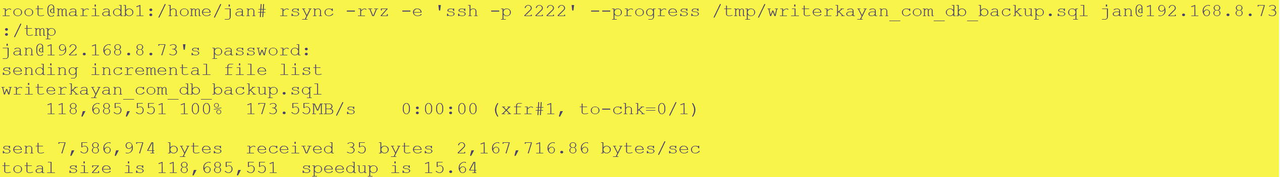# On the original Maria DB single instance, change the following to suite your SSH port, file names and IP: rsync -rvz -e 'ssh -p 2222' --progress /tmp/your_exported_db.sql [email protected]:/tmp