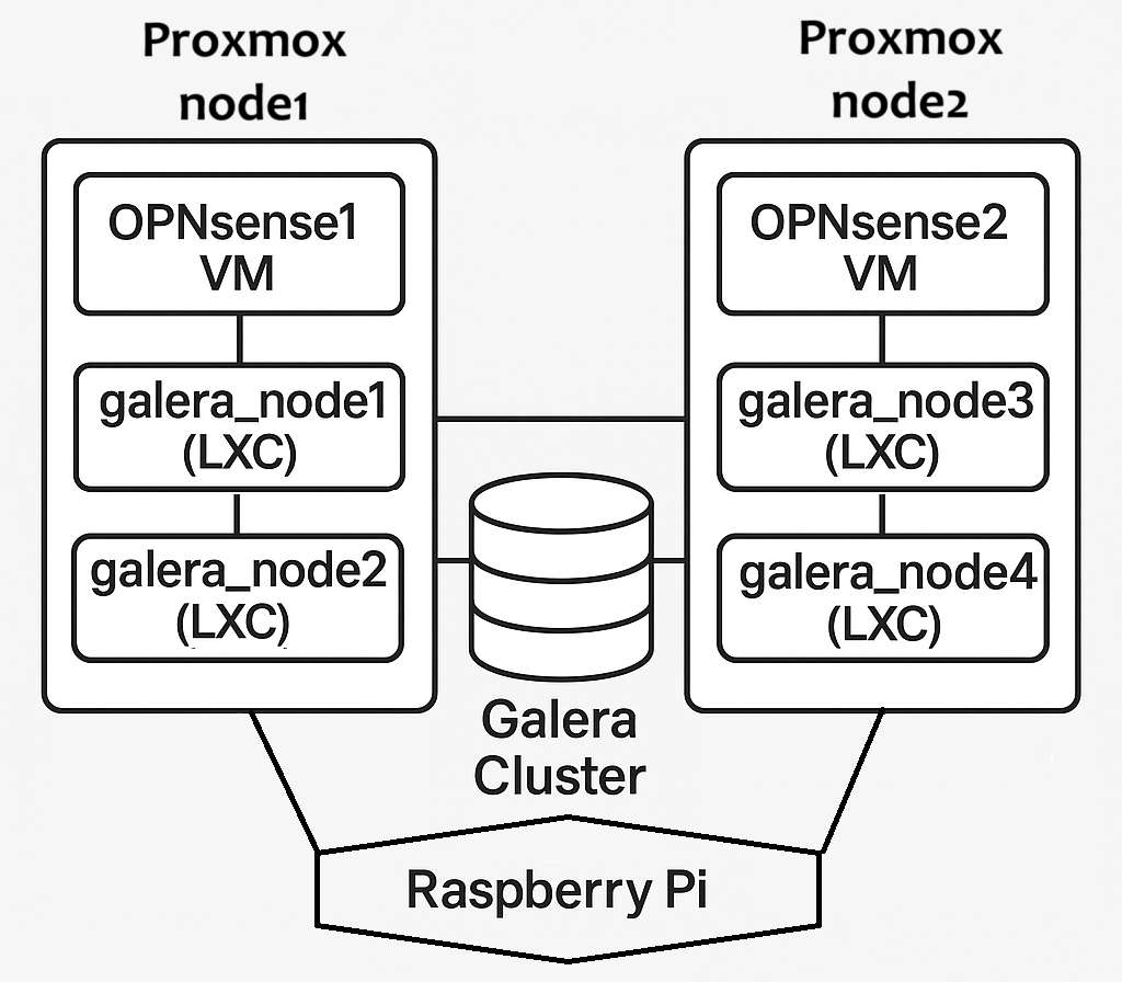 - Imagine that you have two proxmox nodes each with two galera nodes and one Proxmox node goes down. That means that 50% of nodes is down and there is no majority.