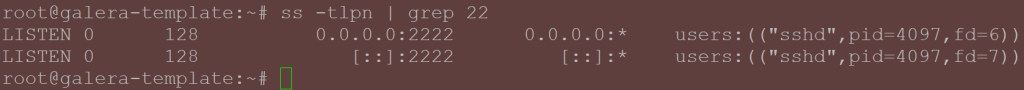 nano /etc/ssh/sshd_config # In case you do not have sudoers (above) installed, use 'su -' and then run this command without sudo sudo systemctl restart ssh ss -tulpn | grep 22 # You should see a line that includes [::]:2222