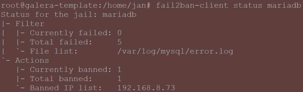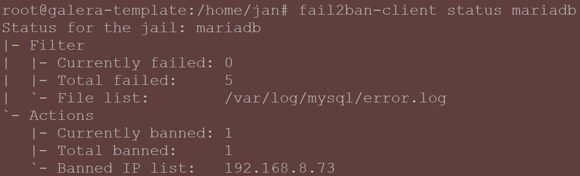 systemctl reload fail2ban systemctl restart mysql # Allow temporary access to your instance using user 'root' - the password mariadb -u root -p # Replace the IP below with your testing host ip GRANT ALL PRIVILEGES ON *.* TO 'randomuser'@'192.168.8.73' IDENTIFIED BY 'some-long-random-password' WITH GRANT OPTION; FLUSH PRIVILEGES; EXIT; # Now grab another host that has mariadb-client package installed and run a few of these: mysql -h <your_galera_template_host_ip> -u blablah -plalala # You should expect an error saying 'Access denied for user ...' # Now hop on the galera template container and run the following to see the stats: fail2ban-client status mariadb