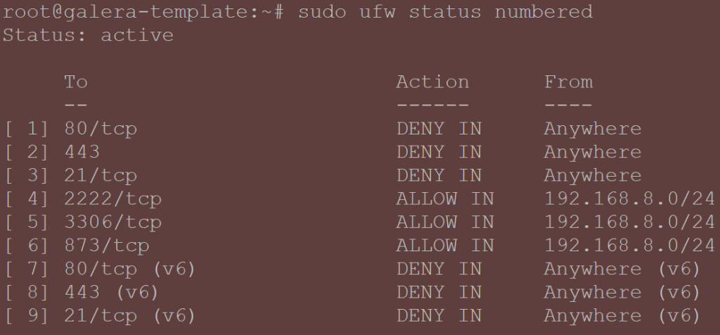 Let’s configure allowed ports on the ufw firewall for SSH, rsync, MySQL and deny HTTP/HTTPS, even if your galera nodes will be behind a firewall and a reverse proxy configuration.
