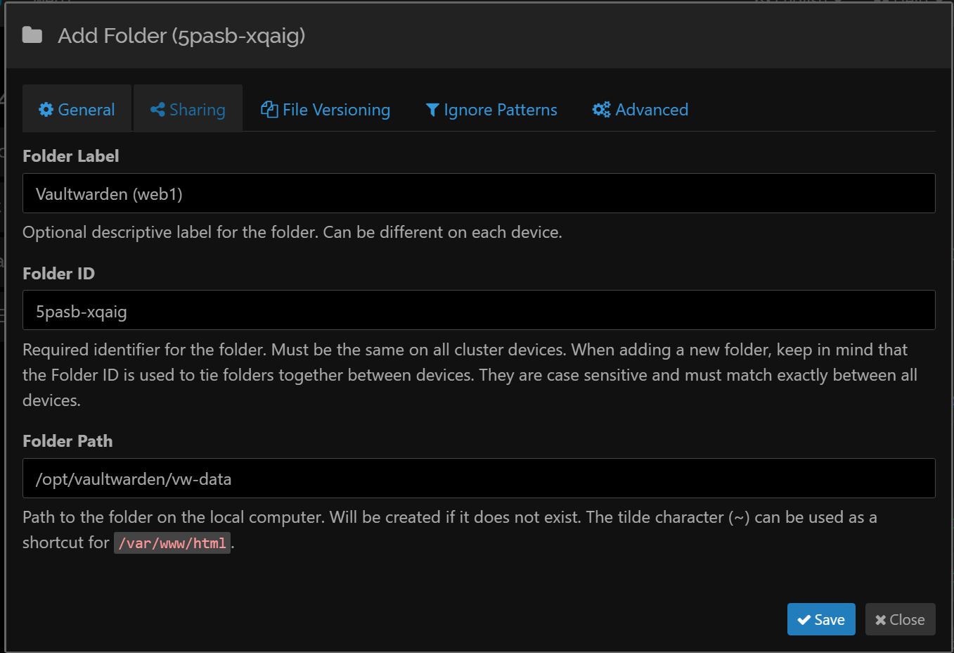 - Sharing tab → if you already have your other Syncthing web servers defined, then tick the boxes.