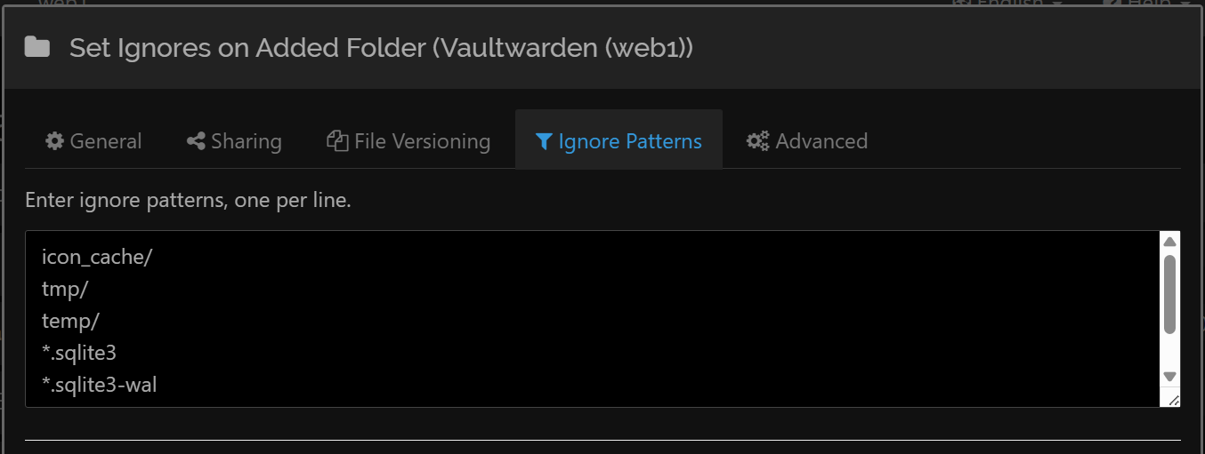 Set up the name, path, trash can, ignore permissions in the Advanced tab and then set up the file/folder patterns to be ignored, as we have done previously.