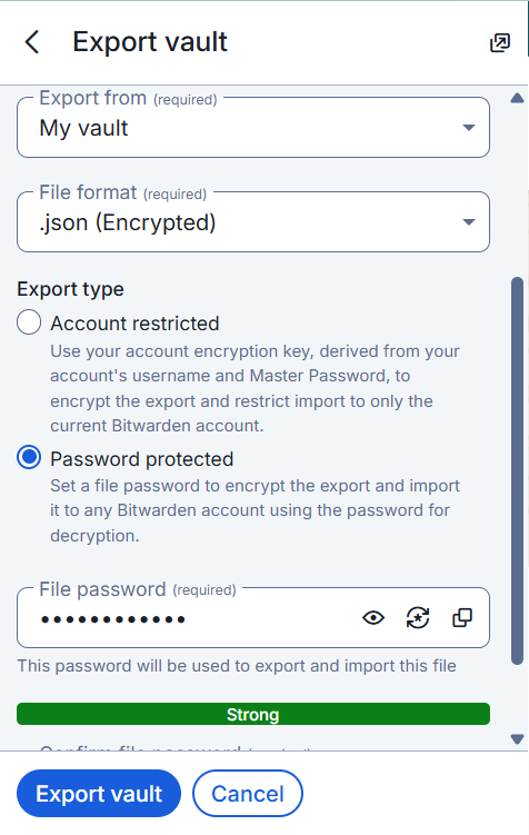 Congratulations, the hardest part is done! Your infrastructure is in place including detailed monitoring on a granular level. Let’s migrate your existing data from Bitwarden. How can you move them over?