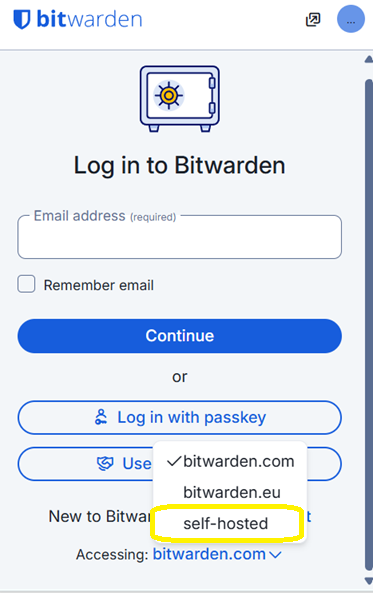 - Simply log out your Bitwarden account and, as shown below, click on the ‘Accessing’ option and choose ‘self-hosted’.