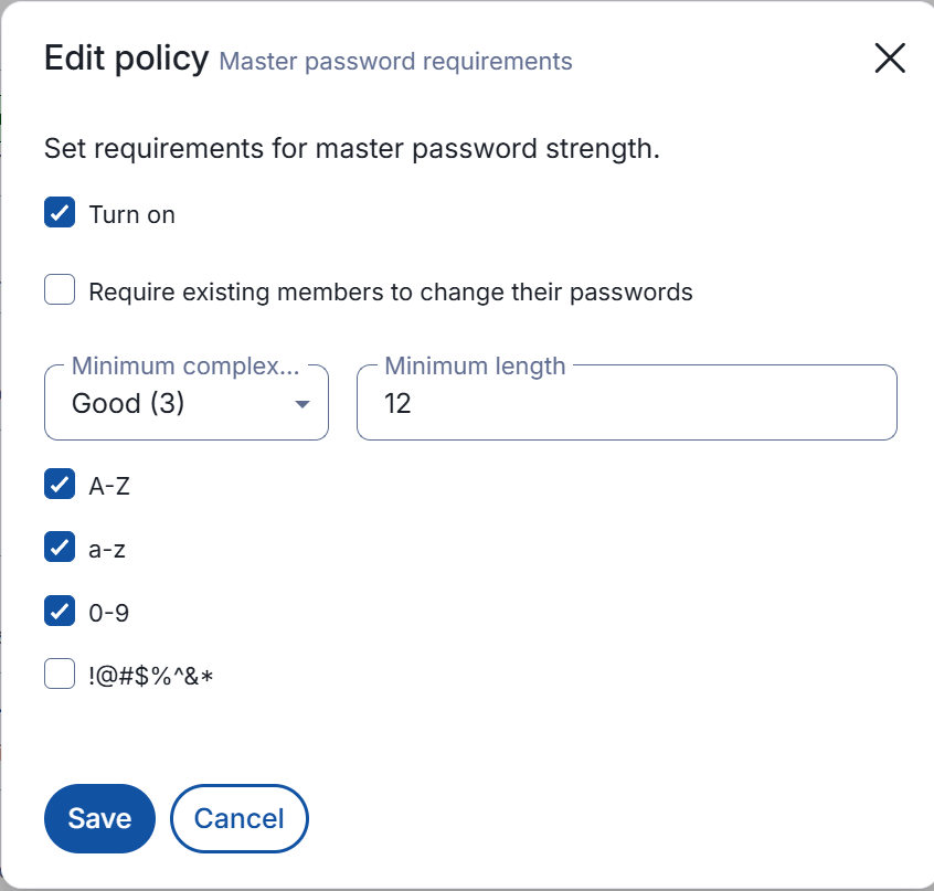 - Similarly, set up Master password requirements. Their length matters way more than complexity. Minimum recommended is 12 characters (marked as ‘Good (3)’ in Vaultwarden).