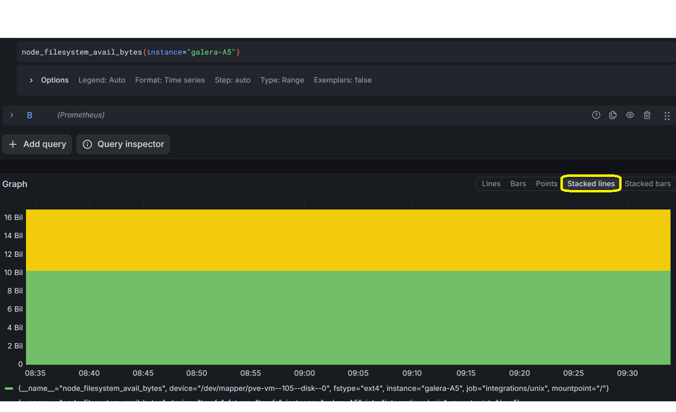 For queries such as those related to drive space available versus used, you can change the graph style to ‘Stacked lines’. I recommend you to play around in Grafana for a while.