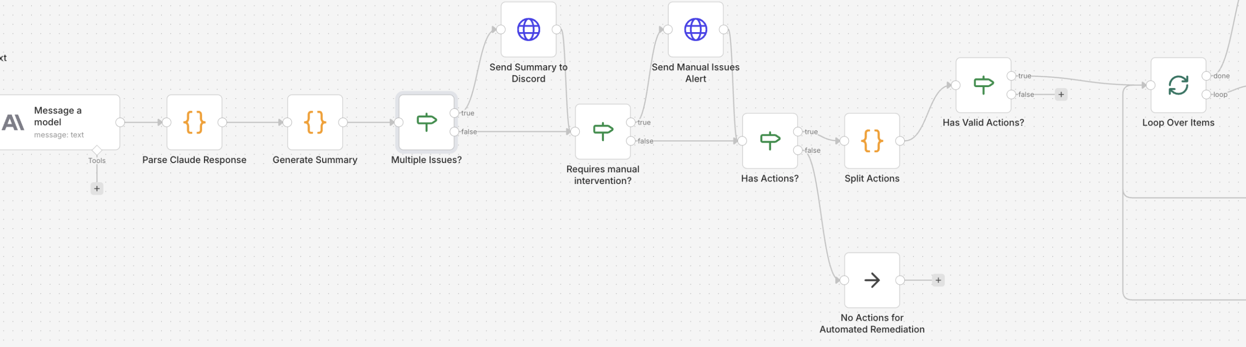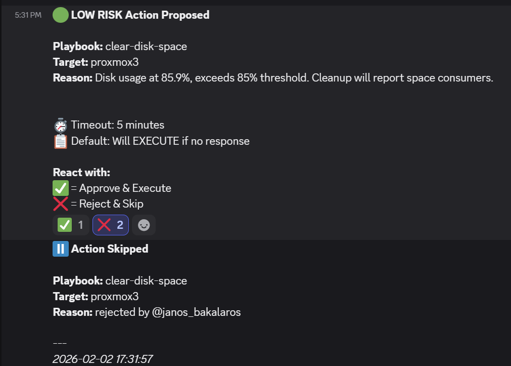 - Similarly, some issues may require manual intervention and thus cannot be processed using a pre-defined automated job. Those will be flagged before the approval workflow kicks in with recommended actions (logs from Loki are pulled to provide more accurate information).
