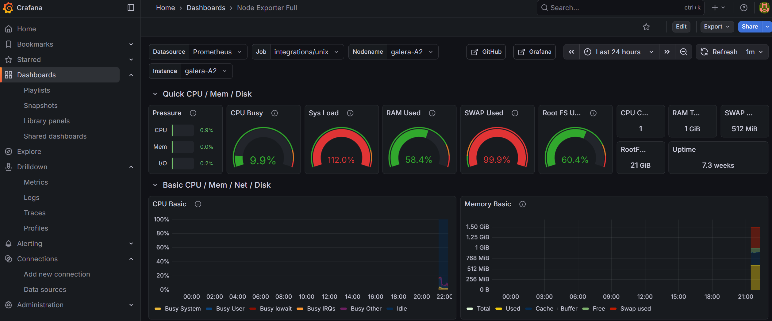And what do I know? I can already see an issue with my galera-A2 node in terms of CPU and swap usage (I resolved that manually but boy, would it not be nice to have an automated solution? Hint hint for Part 2):