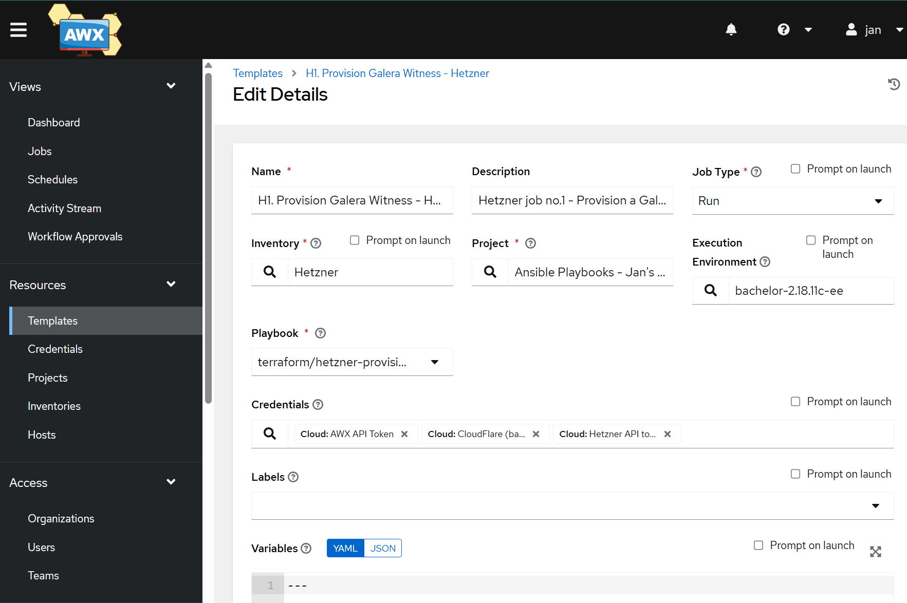 AWX API Tokencredential and theHetzner API Tokencredential and theCloudFlare API token(so 3 in total!). - Project: Select your